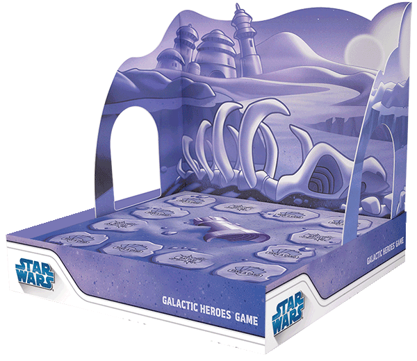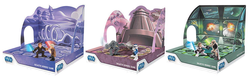 As part of our work with Hasbro, we were asked to develop three SKUs for a Star Wars licensed product line. Our role included package design, artwork, illustration, product instructions, and card design. A key feature on the back of each package was an image showing the game in use. This visual was especially important because the box insert functioned as both the game board and a pop-up background. The challenge was that the product had not yet been manufactured, and no working prototype was available to photograph.